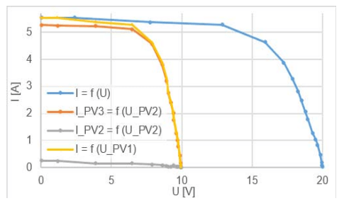 The shading variant analysed next is the complete obscuration of one PV generator connected in series to a parallel group of roof tiles (fig. 16). When analysing I-U characteristics of the presented system (fig. 17) it can be noted that the value of short-circuit current Isc of the system is the sum of currents generated by PV2 and PV3 tiles. The obscured PV1 roof tile was bypassed by a by-pass diode, owing to which the roof tiles from the parallel system may generate maximum values of currents and are not limited at 50%, as was the case in the system from figure 10. However, the bypassed series roof tile does not generate voltage in practice (only the by-pass diode voltage is visible), so the total voltage of the system is the sum of voltages of parallel roof tiles and voltage on the by-pass diode of the PV1 tile. In the circuit, the maximum value of power generated is 67.55 W.