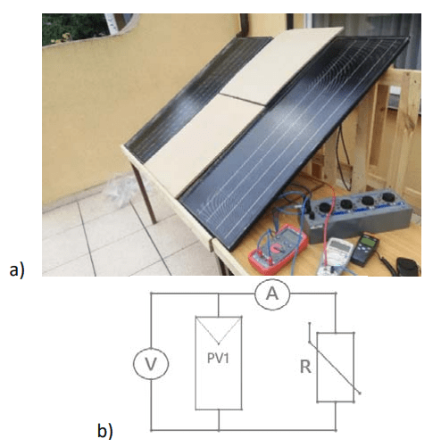In order to check the impact of the configuration of connections and the locations of the PV roof tile shading, many measurements in different variants, on the test stand presented in figure 2a were carried out in accordance with the measurement diagram from figure 2b. During the measurements, environmental conditions were very stable, therefore, the accurate observation of relationships and the drawing of correct conclusions were possible.