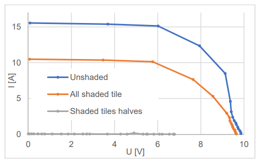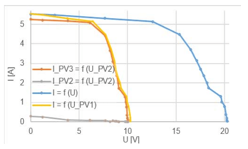 When analysing characteristics of the three PV roof tiles in a series-parallel connection for the variant in which halves of roof tiles in the parallel chain from figure 13 are shaded, it is possible to observe that the parameters of the circuit are determined only by the PV1 roof tile from the series (current, voltage and I-U characteristics are similar to a single roof tile, and are described in fig. 3). PV2 and PV3 tiles generate 2.53 A and 2.75 A respectively when short-circuited, but they are disconnected from the circuit (bypassed) by the by-pass diodes, so they do not introduce any changes in the circuit. Maximum generated power is 28.61 W.