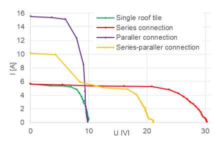 The study of the impact of configuration of connections on electrical parameters of photovoltaic roof tiles was conducted within one day in July 2021. The value of radiation power density osciliated within 980 – 988 W/m2 during the measuring tests. The study covered a single PV roof tile and the connection of three roof tiles in a series, parallel and mixed configuration (one roof tile connected in series with tiles connected in parallel). Based on the obtained measuring data, current-voltage characteristics presented in figure 3 were plotted.