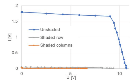 When comparing graphs I = f(U) of a single PV roof tile for different cases of shading from figure 5, it is possible to observe a very high decrease in short-circuit current Isc for panel variants both with shaded columns (0.02 A) and in the obscured row of cells (0.05 A). The roof tile practically does not produce current (and thus also power). For a case with shaded columns (fig. 4b) the open circuit voltage Uoc is lower in comparison to the situation with the shaded row (fig. 4a) and amounts to 6.7 V and 9.4 V respectively. On the other hand, the unshaded roof tile generated open circuit voltage equal to 10.7 V and short-circuit current equal to 1.79 A at irradiance of E = 591 W/m2 , which results in the generation of power equal to 15.02 W.