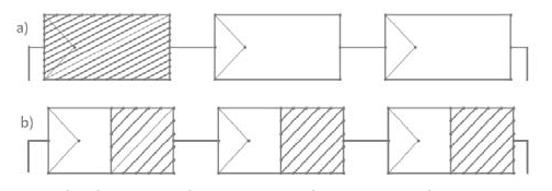 Other tests were carried out using a chain of three PV roof tiles connected in series with one whole shaded PV generator (fig. 6a) and with shaded halves of all roof tiles (fig. 6b). The obtained characteristics I = f(U) were compared with the characteristics of unshaded PV roof tiles (fig.7).