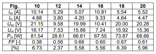 In the variants related to obscuration of the PV cell row or column, as well as to the total shading of the PV roof tile in the parallel branch, similar reductions in the maximum power Pm were observed in relation to the unshaded system. The output parameters of the systems presented in figures 14, 18 and 20 and the current-voltage characteristics (fig. 15, 19 and 21) carried out for them are very similar to each other, which is the best of the analysed situations, with the shading of the PV cells. The value of the generated power, in comparison with the system without shadings, was lower by about 9-17%. When analysing characteristics I = f(U) of individual cases from figures 15, 19 and 21, we can only observe a reduction in the value of short-circuit current Isc, at invariable open circuit voltage Uoc, in each of these cases, which is a good situation from the point of view of operation of a photovoltaic inverter. The value of power generated in these systems is similar to the one generated in the configuration from figure 16, however, a change in the value of currents and voltages is observed. This system is characterised by about twice the value of current and half the value of voltage in view of the operation of the parallel part of the system only, at complete shading, and thus, disconnection of the PV1 roof tile by the by-pass diode. The shading situation which causes the smallest losses of generated power is presented in fig. 16, when the horizontal row of PV cells was subject to obscuration. It was then that the open circuit voltage generated by the obscured roof tile was higher than in the case of obscuration of the columns. This translated into power losses in comparison with the system without shading by only 9%, and generation efficiency that was most similar to the operation of the system under unshaded conditions. The obtained fill factor FF of the unshaded system had a very low value, due to the odd number of roof tiles in the series part of the system.