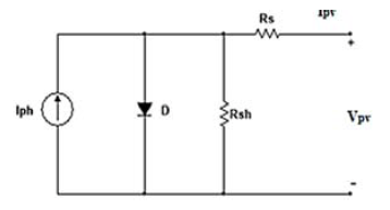 PV cells represent the main component of the PV power system, which is made by two or more wafers of doping Silicon. One cell is generated a small amount of power, about one watt[5], this value insufficient to load requirement. A group of solar cells are blocked together in parallel and series via grid collector busbar to get desired power value and this block is called a PV module. Also, a number of PV modules are arranged in series to constitute a string and increase the voltage to the desired level. A group of strings connected in parallel to form an array and enhance the output current. In the night, the solar cell is not active and act as a P-N junction diode[6]. Depending on the Shockley diode equation, the single diode model represents the simplest and more common PV model [7]. The model is used to describe the output characteristics curves. Fig.(1) represent the single diode modelling of PV cell, which consists of parallel connection between diode and current source with shunt, and series resistors. The diode represents the effect of the P-N junction of the PV cell. The series resistance is used to describe the internal losses of one PV cell and adjacent PV cells connected to it and shunt resistance to show the effect of ground leakage current.