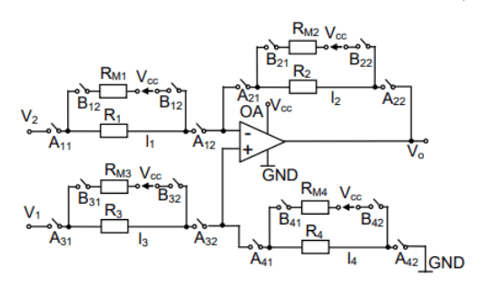 The diagnostic system of the branch circuit of the differential amplifier is shown in Figure 1. This system consists of two resistors (amplifier resistor: R1,…, R4 and measuring RM1,…, RM4) and a DC voltage source Vcc. During the measurement of the correctness of the operation the branch differential amplifier the input signal source (V1, V2) and the output should be disconnected. In this aim the switch A11, A31, A22 should be opened. At the same time, the voltage measurement is switched to the additional (redundant) measuring system. The values of the resistors RM1, …, RM4 are selected so that the measurement of the signal from them should be not a problem for systems measuring the voltage from them. The measured value from RM1, …, RM4 are sent to the input of the intelligent algorithm. The test circuit works is divided into parts: