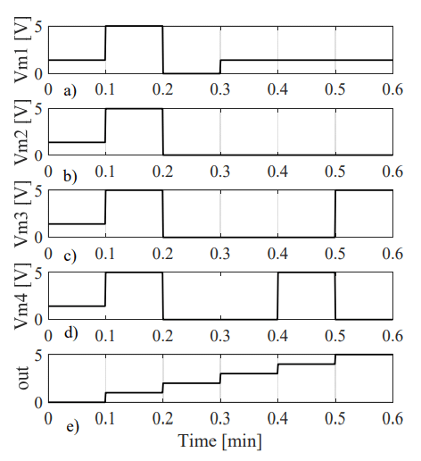 • time interval from t=0,2 to 0,3s (see waveform Figure 3 a), b), c), d)) the input vector IN= [0 0 0 0]T system response y=2 (see waveform Figure 3 e)). This information means that there is a failure in the circuits of the differential amplifier consisting in opening the all resistors (R1,.., R4). The data is listed in Table 1 (row number 4, n=3);