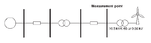 For a better appreciation of the points related to the harmonic signature of type 3 and type 4 WTGs that were discussed in the accompanying paper, measurements obtained at the HV side of the turbine transformer for the type 3 and type 4 turbines are discussed in this section. Measurements were conducted according to the existing version of the IEC 61400-21 standard [10]. The schematic diagram of the system used for the measurements and corresponding measurement point is shown in Fig. 1. The measurements were carried out on a single wind turbine. For both type 3 and type 4 turbines under consideration, the turbine transformer HV side is rated at 10.5 kV, whereas the transformer low voltage side voltage is 690 and 650 V for the type 3 and type 4 wind turbines, respectively. For different cases, wind turbines are connected to different power systems with different nominal voltages. The grid transformer voltage levels are not therefore shown in the figure. The short-circuit apparent power at the HV side of the grid transformer varies between 75 and 115 MVA for different grid conditions.