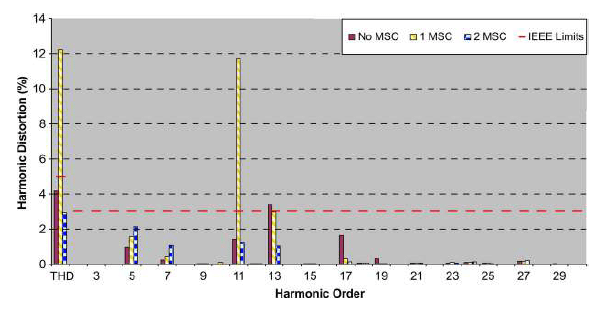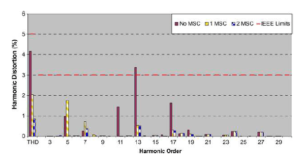 Results obtained from harmonic impedance scan and harmonic penetration studies are shown in Figs. 14 and 15, respectively. The harmonic impedance scan reveals a high impedance at around the 11th harmonic when one MSC is installed. As the 11th harmonic is also generated by the WTGs, the 11th harmonic and the total harmonic distortion can be as high as 12% as shown in Fig. 15. With two MSCs in service or without any MSC at all, the peak resonance point lies approximately around the 8th and the 18th harmonic order, respectively. These operating points will give rise to an acceptable level of harmonic distortion as confirmed by Fig. 15. This is because the WTG does not produce any appreciable level of the 8th and 18th harmonics. The mitigation method applied in practice to resolve the high total harmonic distortion (THD) problems is discussed in the next section.