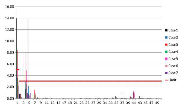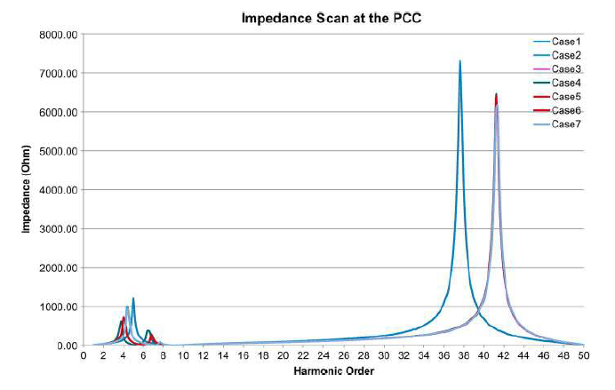 The total harmonic voltage distortion is well below the maximum limit for all cases. Distortion at the 46th harmonic is marginally higher than the IEC limit due to a grid resonance point around the 43rd harmonic as shown in Fig. 10. This is not, however, expected to cause any equipment malfunctioning, and no harmonic mitigation method is necessary in this case for the following reasons.