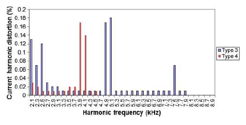 2) High order harmonics associated with the PWM switching and its multiples. For the type 3 turbine, the most significant components include the 49th and 51st orders. The 39th and 41st orders are the largest for the type 4 turbine. Note that these harmonic are dependent on the converter switching frequency which may vary from one turbine type to another or even between two different turbines of the same type. No generic or general conclusions can therefore be made with respect to the largest high frequency harmonic current components. It is, however, understood that the most dominant switching harmonics are in the range of 2–10 kHz.
