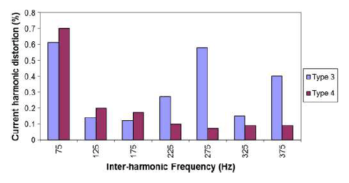 Figs. 2–7 show the harmonic current spectrum of type 3 and type 4 turbines for different frequency ranges of interest. A pessimistic assumption is taken here where the largest individual harmonics for different turbine loading conditions are stated in the same figure. In reality, all the largest individual harmonic currents cannot occur simultaneously. The total harmonic distortion measured in practice is therefore generally lower than that calculated from these figures unless a resonance condition occurs.