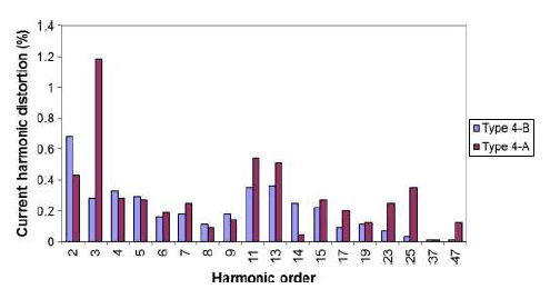 3) Zero-sequence triplen harmonics including the 3rd, 9th, and 15th could appear due to an asymmetry in the voltage of the medium voltage (MV) grid. For the type 3 and type 4 turbines discussed in Figs. 2–4, the zero-sequence triplen harmonics are within the acceptable range. Significantly high level of harmonic currents could occur if the WTG is connected to a weak and unbalanced source power system with some level of background triplen harmonic voltage. Note that this excessive harmonic distortion is not generated by theWTG, but it is the contribution of the grid which is measured at the WTG terminals. An example is shown in Fig. 5 for the type 4 turbine. In the figure system, conditions A and B indicate connection to a highly unbalanced and a relatively balanced source power system, respectively. Such high level of low order harmonic currents can be mitigated by various harmonic mitigation methods that will be explained later in this paper. Note that WTGs are generally connected to the MV grid via a star–delta connected transformer. The use of delta winding at the high side avoids the transfer of zero-sequence triplen components at the high side under balanced operating conditions. The zero-sequence components can, however, flow in the star winding unless the neutral point is not connected to the earth.