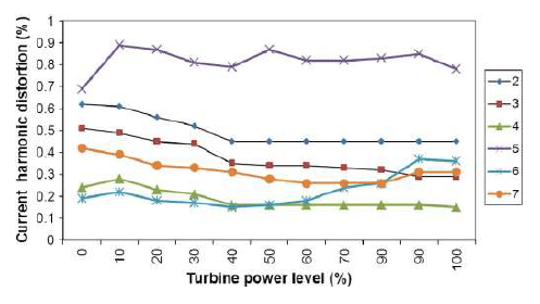 Another conclusion that can be drawn from these figures is that, in all cases except for the 2nd harmonic variations for the type 4 turbines, the harmonic distortion remains practically constant when operating at 60% loading and above. More distinct variations can be observed at light load operation.