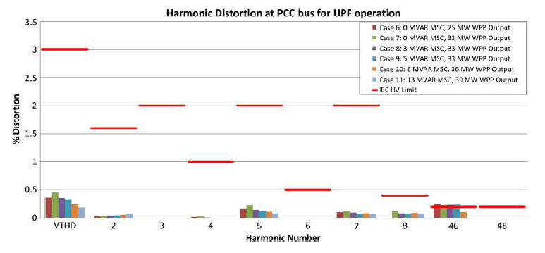 Fig. 11 shows the variation of the harmonic voltage distortion as a function of the level of the reactive power compensation. This figure indicates that the calculated harmonic voltage distortion for the 6th order harmonic marginally exceeds the IEC limit for higher level of reactive power compensation. These levels are unlikely to cause any equipment malfunctioning on the WPP itself and will have negligible effect on the PCC. They can be readily reduced by tuning the reactive power compensation capacitors; however, it is not necessary in this particular case for the following reasons.