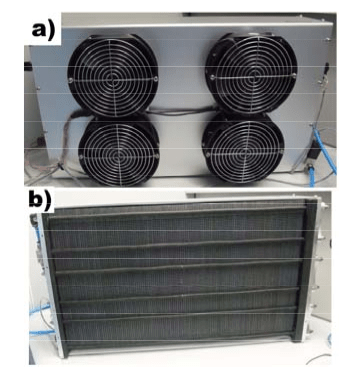 Apart from electricity, the waste heat and water are the output of the PEMFC stack. In practice, the efficiency of the PEMFC stacks amounts to approx. 50%. Thus, in the case of the tested device, in addition to electricity of 5 kW, also the heat of 5 kW was received, which must be removed from fuel cells in this H5000 PEMFC stack. The most commonly used methods of waste heat collection include: a) air cooling using fans, b) cooling using the liquid medium, c) cooling using the passive elements [29-31].