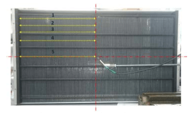 The flow qualitative test (comparison of the air inflow distribution) using the thermoanemometric probe was carried out within ¼ of the air inflow area to the H5000 FC stack. During the tests, the axial symmetry of flow phenomena in the tested H5000 device was assumed. Fig. 11 presents the photograph of the H5000 PEMFC stack with distribution of measuring series.