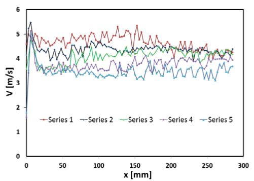 In turn, Fig. 12 presents the determined changes in air inflow speed to the H5000 fuel cell stack according to the adopted measuring series. For the distance, the value “0” was assumed on the edge of the FC stack.