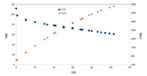 Fig.6 shows another dependence between voltage (U)- current (I) and power (P)-current (I) under expanded range of electrical load, i.e. above the nominal power of 5kW.