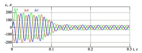 When setting symmetrical phase voltages of the stator on the model, the timing diagrams of which are shown in fig. 2, the values of the stator phase currents (fig. 3), the rotor phase currents (fig. 4) are obtained. The values of the stator phase voltage and the stator and rotor phase currents are given by the instantaneous values of these parameters.
