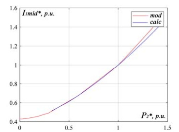 Based on the results of tables 3 and 2, the dependences are plotted for the relative value of the active power consumed from the network on the relative value of the useful power P1*=f(P2*) (P1/P1н=f(Р2/Р2н) (Fig. 7) and the dependence of the average relative value phase current of the stator on the relative value of useful power (I1mid*)=f(P2*) (I1/I1н)=f(Р2/Р2н) (Fig. 8).