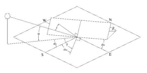 The values of insolation obtained using the daily integration method are to be converted into insolation values for solar panels oriented and tilted in a particular way. The position of solar panels is set at the following angles (Fig. 2): the tilt of the solar panels β and the azimuth angle of the solar panels αw. The incident angle of sunlight on the surface of the solar panels i is determined as follows: