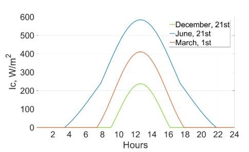 Figure 4 shows the calculated insolation on the surface of a solar panel having a 30° tilt angle on December 21, June 21, and March 1.