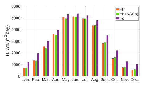 The reliability of the calculation method and the data obtained have been assessed. To perform the assessment we analysed the calculated total monthly radiation incident on a horizontal as well as on a tilted surface. The results are shown in Fig. 5, where Hh.calcu is the calculated average monthly total radiation, Hh is the average monthly total radiation according to NASA [1], and Hc is the monthly average total radiation.