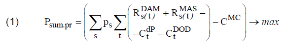 where: ps – the probability of a scenario with a corresponding price for BESS services;; Rs(t)DAM – income from the provision of services at DAM in the scenario s in hour t ; Rs(t)MAS – income from the provision of services at MAS in the scenario s in hour t ; Ctdp – the cost of using the battery on DAM / IM and MAS; CtDOD – the cost of degradation of the battery at the allowable depth of discharge and below the allowable level; CtMC – service costs.