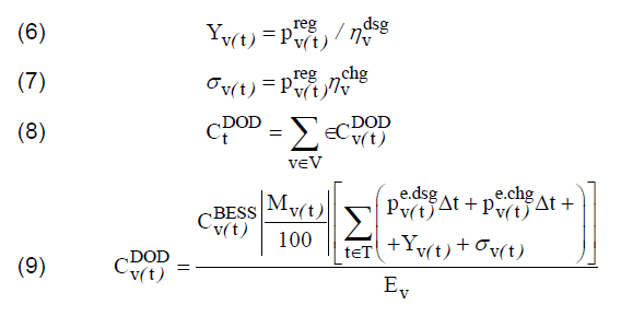 where Ev – full capacity of BESS, kW * h; ηvdsg та ηvchg – charge and discharge efficiency of the v-th battery, respectively; pv(t)reg – command to adjust (discharge/charge) in the period t ; pv(t)e.dsg – power at which for time t the v-th BESS will be completely discharged; pv(t)e.chg– power at which for time t the v-th BESS will be completely charged; σv(t) – the amount of electricity, according to the unloading command, which charges the v-th BESS, during the time series t ; Yv(t) – the amount of electricity, according to the command to download, which discharges the v-th BESS, during the time series t ; Сv(t)BЕSS – the cost of the v-th battery, taking into account the level of its degradation – Mv(t) .