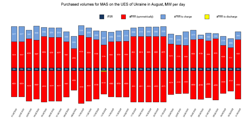 To date, an analysis of the electricity market for August 2020 has been published on the NEC Ukrenergo website. In fig. 2 shows the results of the MAS. In the UES of Ukraine, the purchase of frequency support reserves (FSR) averages 21 MW per hour. The purchase of aFRR (automatic frequency recovery reserves) during the month was volatile due to insufficient supply of market participants. 31% – 71% of the auction needs were purchased for loading aFRR (on average 53%), from 10% to 95% for unloading (on average – 58%). [11]