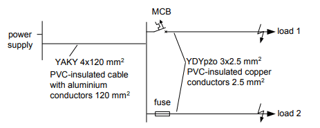 Figure 2 presents the structure of the analyzed example installation. It is assumed that the single-phase loads are supplied via PVC-insulated power cable having aluminium conductors (120 mm2) and PVC-insulated copper conductors (2.5 mm2). The first final circuit is protected by a miniature circuit-breaker (MCB) and the second by a fuse.