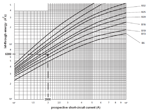 For a prospective short-circuit current equal to 2 kA, the value of the B16 MCB let-through energy is equal to 6300 A2s (Fig. 3). According to (6) and Tab. 1, it gives the temperature rise of the conductor YDYpżo 3×2.5: