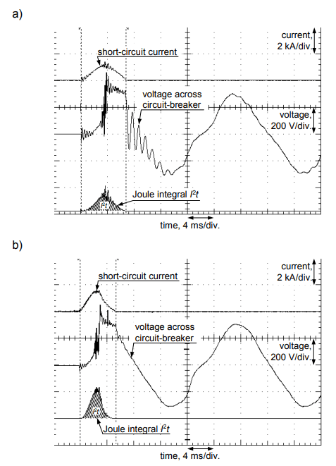 In order to check the real temperature rise, the laboratory test of the MCBs let-through energy has been carried out. Figures 4, 5, and 6 present results of this test for the MCBs B16, C16 and D20 respectively. The process of current breaking and the let-through energy value have been verified for prospective short-circuit currents 1 kA and 2 kA. Results of the temperature rise calculation, for data obtained from the laboratory test, are presented in Table 2.