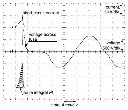 Calculation of the temperature rise on the base of the selected manufacturer data (“ETI”, Tab. 4) enables to say that gG16 fuses have let-through energy not higher than 1060 A2 s, what is clearly lower than the max normative value (1210 A2 s – see. Tab. 3). This value also gives a very small increase in the temperature of the conductor YDYpżo 3×2.5 (1.15 K). A laboratory test of the fuses shows (“Lab”, Tab. 4) that in practice the let-through energy can be significantly lower than the manufacturer declaration (positive effect). Example oscillograms obtained from the testing of a fuse are presented in Fig. 7.