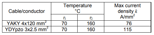 One can see that the temperature of the conductor YDYpżo 3×2.5 increases only slightly. In case of the cable YAKY 4×120, the increase is completely negligible.