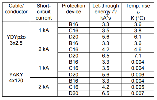If one compares the value of the maximum let-through energy for the MCB B16 derived by the manufacturer (Fig. 3: I2t = 6300 A2s, for 2 kA) with the let-through energy obtained during the laboratory test (Fig. 4b: I2t = 3300 A2s, for 2 kA), it is seen that the latter is almost two times lower. It gives only the 3.6 K temperature rise of the conductor YDYpżo 3×2.5 in case of a short-circuit with current 2 kA. The temperature rise of the cable YAKY 4×120 is – obviously – negligible (0.004 K). For other MCBs (C16 and D20) the temperature rise of the conductor YDYpżo 3×2.5 is maximum around 7 K and for the cable YAKY 4×120 is close to 0 K.