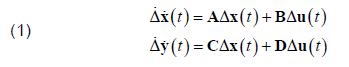 where: Δ is the prefix which denotes a small deviation, A is the state or plant matrix, B is the control input matrix, C is the output matrix, D is the matrix, which defines the proportion of input which appears directly in the output.