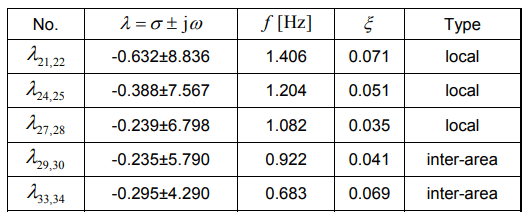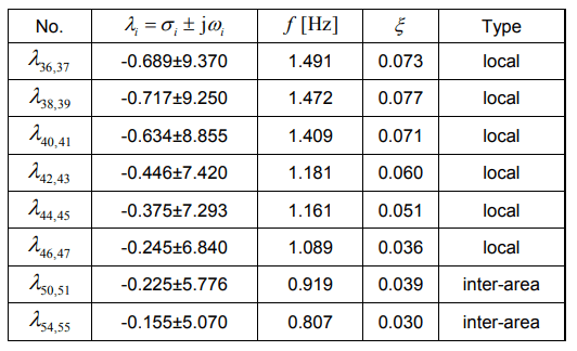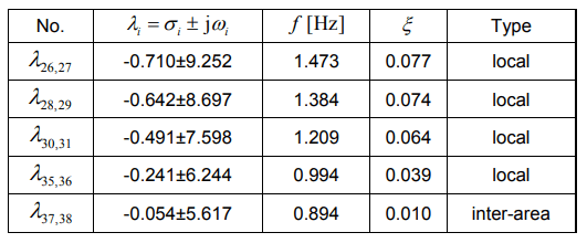 The research starts with the analysis of the basic case 1 i.e., identification of electromechanical oscillations. As part of this study, the eigenvalues related to local and inter-area oscillations were distinguished, as well as the oscillation frequencies and damping coefficients. The results for the Case 1 are presented in Table 2.