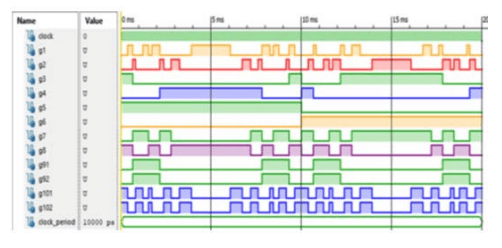 Fig. 11. Show the pulses pattern signals for each MOSFET in ISE Simulator of (VHDL) code for (FPGA) Kit. A prototype of a 25-level single-phase inverter with (FPGAs) (SPARTAN-3E) is employed as a gate driving circuit as shown in Figs. 12. to verify the simulation results, the (25- level) single-phase inverter practical circuit is gate driving with opt-isolators circuit type (TP250). It consists of Modified full-bridge twelve (MOSFETS) reduced switches inverters that are supplied form. Four PV Panels Also, the output frequency it’s assumed to be 50 Hz.