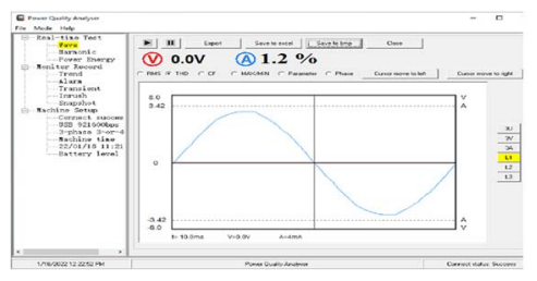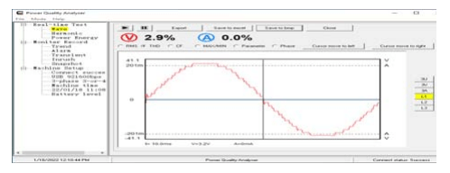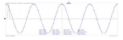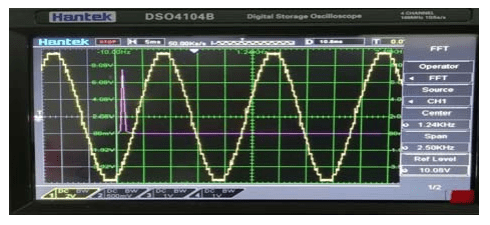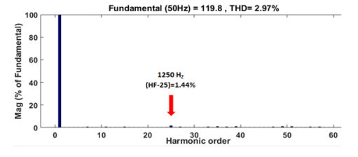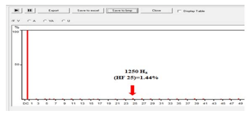 Figs. 13.a. and 13.b. shows the output waveform and by using a power analyzer the practical THD of the load voltage is equal to (2.9%) as shown in Fig. 13.c. while Fig. 13.d. shows the practical FFT of the load voltage. and Figs. .14. a., 14.b. and 14.c. show the waveform of output current and its FFT and THD = (1.2%) for (25-level) single-phase inverter at M=1 and the dc input voltage vdc1= 6V and vdc2=30V. The output inverter voltage spectrum shows the elimination of harmonics for inverter output voltage (from 3rd to 23rd) and the lowest order harmonic (LOH) is 25th (h25=1250Hz)..