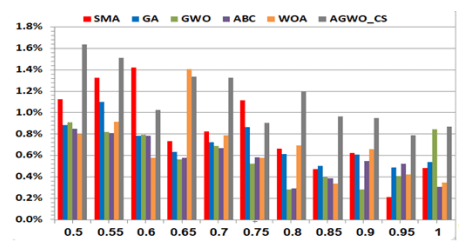 Fig. 8. Show the resulting THD from each algorithm used (SMA), (GA),(GWO),(ABC),(WOA), and (AGWO_CS) with Optimum THD from minimum points vs. modulation index 0.5 to 1 and