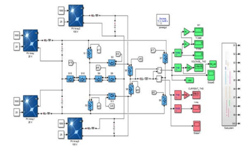 A 25-levels single-phase inverter with a PV array is The simulation was done in MATLAB/Simulink as shown in Fig. 7. The switching angles are chosen at M=1 and the frequency f=50Hz. The inverter drives the R-L load of R=20Ω, L=100mH. Vdc1=10V and Vdc2=50V.