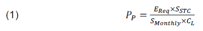 With: PP: Peak power of the photovoltaic field (W); EReq: Daily requirement (Wh/day); SSTC: Sunshine in STC conditions (SSTC = 1KW/m2); SMonthly: Sunshine scaled annual average (KWh/day/m2); CL: Correction factor applied to take account of the different losses (CL = 0.7).