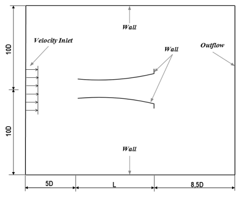 The domain of the simulation is illustrated in Figure 3. The inlet of the flow is located at 5 times the inlet diameter of the diffuser (D). The velocity inlet boundary condition was applied at this location. The flow leaves the computational domain at 8.5D distance from the outlet plane of the diffuser with the outflow boundary condition. The side walls were set as a non-slip wall that are sufficiently far away from the area of interest to ensure the minimal effect on the flow characteristics near the diffuser. The computations were carried out using the commercial software Ansys Fluent 2019 R1. The flow was assumed to be steady and the incompressibility effect was neglected. This is reasonable because wind turbines usually operate at a much smaller velocity than the speed of sound. An initial undisturbed wind velocity of 5 m/s was prescribed at the velocity inlet plane. The same velocity was employed by Ohya et al [10] in their experiment. The turbulence closure was modelled using the two-equation SST k-ω model according to Menter [20]. This model combines the the standard k-ε model [21] in the freestream and the Wilcox k-ω model [22] for the wall bounded flow. The model is good for predicting flows with a strong adverse pressure gradient as demonstrated already in [11], [15]-[19], [23]-[25]. The pressure velocity coupling uses the SIMPLE method. All the variables were solved using the second order discretization. The computations were carried out for 10,000 iterations, otherwise convergence was achieved if the residual of the momentum reaches 1e-6.