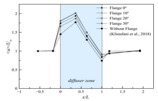 Figure 9 presents the velocity profiles for different flange angle of diffuser compared with curved diffuser without flange and without diffuser at all. It’s to clarify the rate of wind flow within various configuration of diffuser. It can be seen that the wind velocity at the upstream zone is same for all the configurations of curved diffuser. The wind velocity at section x/L = -0.54 (far away from inlet diffuser) not influenced by the presence of the curved diffuser. It becomes evident that the wind velocity slightly increases at the near inlet diffuser (x/L = -0.18), although the difference of wind velocity increases for all the curved diffuser within and without diffuser is small. The increase in wind velocity is clearly visible when entering the diffuser (x/L = 0), where the curved diffuser equipped with the flange 10° and 20° have the good performance than the others. However, the greatest increase in wind velocity along the diffuser (x/L = 0.36 until x/L = 1) is actually generated by the curved diffuser with flange 10°. Overall, it can be clearly seen that Curved diffuser equipped with flange have wind velocity increment bigger than curved diffuser without flange (x/L = – 0.18 until x/L = 1).