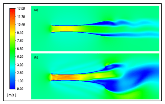 Comparison of velocity contour on curved diffuser without flanges and with flanges 10° can be seen in Figure 7. Vortices flow at downstream diffuser with flanges 10° larger (indicated by blue area) than flow through curved diffuser without flange. The large vortexes in the downstream area have suction effect in the upstream areas; as a result the wind that crosses the upstream diffuser increases the wind velocity (indicated by orange contour). The velocity contour strengthen the previous discussion (Figures 5 and 6), namely curved diffuser with a flange 10° giving better performance than curved diffuser without flange. As informed in table 4, the difference wind increment of both geometries is 30.96%.