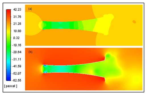 In line with the discussion result of the velocity contour, the pressure contour also shows that the curved diffuser with flange 10° provides the best performance. This is indicated by the high pressure in the downstream region and at area around the diffuser wall, thereby strengthening the evidence that the suction effect caused by the curved diffuser with the flange 10° is very strong compared to the diffuser without the flange. Pressure contour regarding the comparison of curved diffuser without and with flange 10° is shown in figure 8.