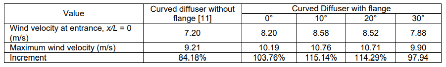2. Curved diffuser flange 10° shows the highest improvement of wind velocities, not only the centreline wind velocity but also the average wind velocity. The highest increment of the wind velocity at the diffuser centerline section is 115.14% with the maximal velocity is 10.76 m/s.