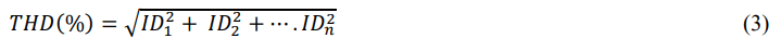 IDn represent the magnitude of the nth harmonic as a percentage of the fundamental (individual distortion). Grady, in 2012 [4] defined THD as the ratio of the root mean square value (rms) of the harmonic above fundamental to the rms value of the fundamental. Marcuello, Arcega, Plaza, & Ibáñez, in 2011[12] termed THD as the rms value as the proportion of of all harmonic components together to the rms amplitude of the fundamental harmonics. In a white paper by Eaton in 2017 (Eaton, 2017), THD was described as the fraction of the total power of all harmonic components to the power of the fundamental frequency. Similar definition was also given by Durdhavale, in 2016.