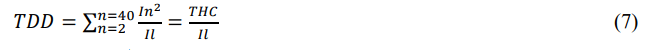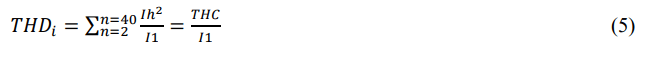 The Total Harmonic Distortion Current (THDi) describes the magnitude of distortion present in a waveform It is derived from the fraction of the Total Harmonic Current (THC) and the fundamental current. It is expressed mathematically as shown in equation 5 below (Durdhavale, 2016)